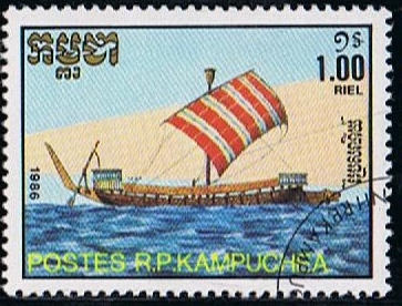 The warship depict on this stamp is an Egyptian warship with a battering ram from circa 1200 BC. She had one powerful steering oar on the stern, one single mast, conventionally stayed, the mast carried a fighting top which was manned by archers, and the first time the fighting top is seen on a ship. High planked bulwarks protected the rowers. Sailed or rowed.