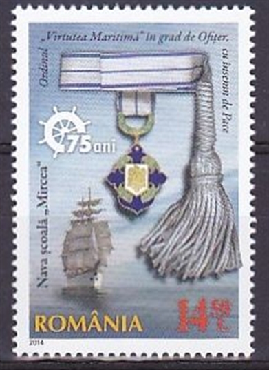 The stamps of the series, with the face values of leu 1.00 and lei 14.50, illustrate the Sail Training Ship “Mircea“ in a training mission, with all its sails in the wind, and the Maritime Virtue Order, in Officer Degree with Peace Symbol, conferred to the Sail Training Ship “Mircea”, by the Decree No. 304/2014, for the first time in the ship’s existence.