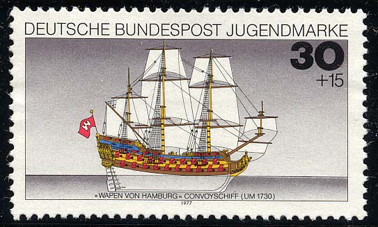 The stamp was made after a model, which is now in the Museum fur Hamburgische Gesichte, the model was built before the actual ship was built, and when the WAPEN VON HAMBURG was sold the new owner got also the model.