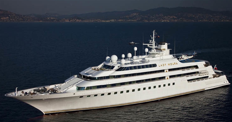 LADY MOURA is a private luxury yacht. She was the ninth largest private yacht when she was launched in 1990, but has moved down the list in 2014 to number 28. She is owned by Saudi Arabian businessman, Nasser Al-Rashid.