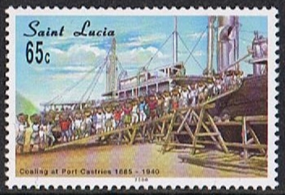 The stamp shows a steamship coal bunkering in Castries, St Lucia, the coal was loaded by mostly women who carried a basket full of coal on her head from the shore to tip it in the bunkers of the moored steamer. The steamer shown on the stamp is not identified.