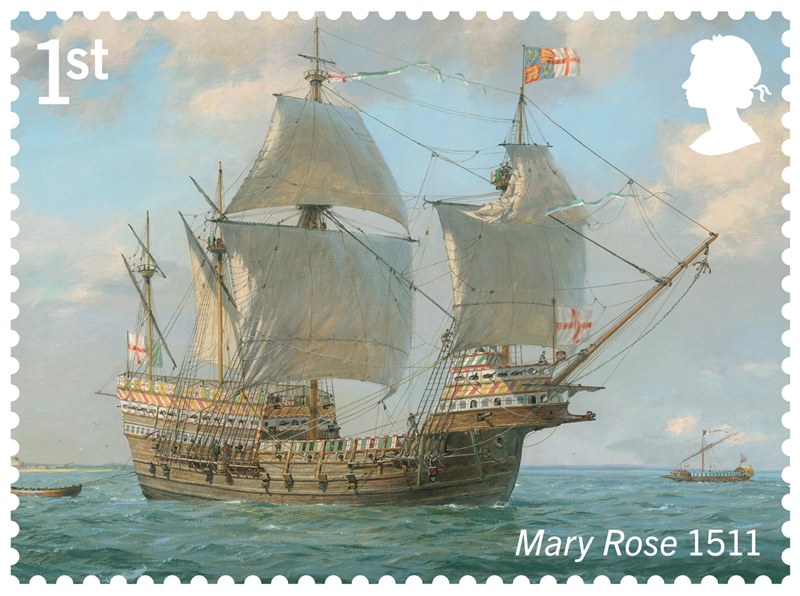 The design of the Nevis stamp is based on the painting by Geoff Hunt: "Mary Rose at Sea".