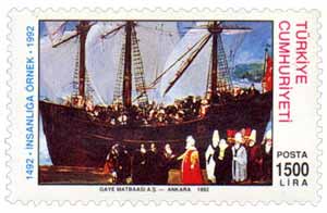 Kemal Reis (1451–1511) (picture 1) was a Turkish privateer and admiral of the Ottoman Empire. He was also the paternal uncle of the famous Ottoman admiral and cartographer Piri Reis who accompanied him in most of his important naval expeditions. He was the first admiral who replaced short range cannons with longe range cannons in the Turkish naval history and made valuable efforts for the conquest of Western Mediterranean by Ottoman Empire. The transportation of Jewish and Muslim people from Andalucia to Turkey who wished to escape from Spain by the galleons of Kemal Reis in 1492 was depicted on the stamp (500 th anniversary of this event).