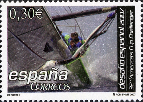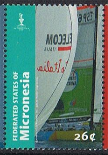 The yacht depict on the Micronesia stamp with this hull colours must be the ESP 88, while the Spanish stamp shows a yacht from the syndicate but not a sail number is visible.