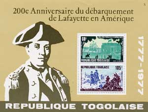 In 1977 Togo issued a set of four stamps and a miniature sheet to commemorate the 200th anniversary of Lafayette’s arrival in America.