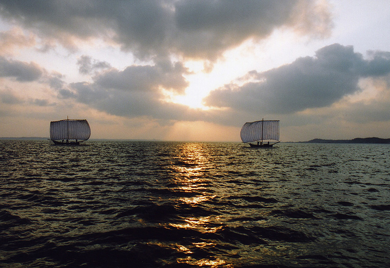 Sailboats on Lake Kasumigaura in Ibaraki Prefecture have a great sail. Wind fills a large sail (12m x 20m) and pushes the boat through the water, pulling a 100-meter network for catching smelt and smelt. Network is a funnel-shaped net bag, which later became known as the trawl. A feature of the boat is at the top of the trawl gear attachment to sailing Ray, and down to the rope that holds the foot parusa.Set stretches or over the side of the boat or at the stern of the boat wake. (See the drawing: Three ropes tied to the yard (tsurinawa) generate not only towing power but also lifting power for sails. The balance among three powers (wind power, gravity and drag) makes the boat to sail in a stable manner.). Fishermen who use such boats, requires a good sense of balance, as strong gusts make the boat unstable. In addition, it is difficult to maneuver a fishing boat, the wind died down. Inventor of “Hobikisen”was Ryohei Orimoto.Ryohei Orimoto was born in Sakaninomiya, Kasumigaura-machi in 1834.The name of his shop was “Aiya” because his ancestors were engaged in indigo dyeing. He did not make a living as a fisherman. He sometimes dragged daitokunet for living and dedicated himself to the improvement and invention of living and agricultural tools. In 1880, at the age of 46, Ryohei invented “hobikisen” for shirauo fishing, which at that time used ditoku net. Usually, two to three fishing boats were used for daitoku net-fishing and more than 20 workers were needed. Ryohei was willing to share his invention of hobikisen with many other fishermen around Kasumigaura, placing what was in the common good of the local community above his personal profit.Thanks to his effort, fishery in Kasumigaura changed from organizational operation centering on the headman called amimoto to individual operation in the unit of family. This paved the way for fishermen to earn income according to their fish catches, instead of being paid on a daily basis, thus greatly contributing to the stabilization of the lives of inshore fishermen. This method of fishing began in the Meidzi era (1868-1912) .Ob this invention can be said that this cultural heritage Kasumigaura world class. When the engine is installed in the period between 1965 and 1975, created a trawler. Boats, currently working as a tourist attraction in late summer and early autumn.