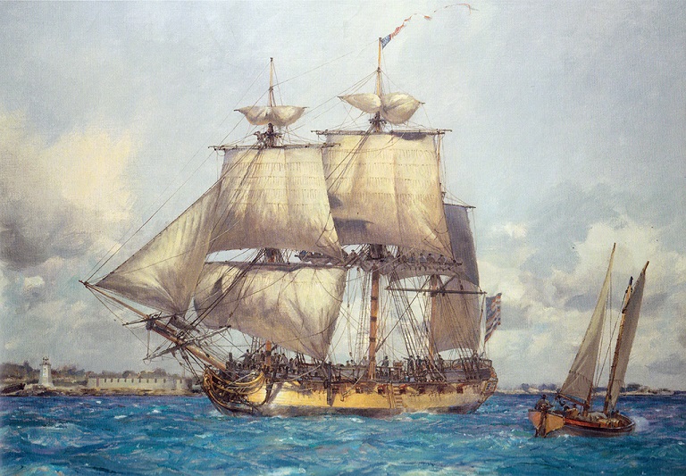 The design stamp is made after painting of Geoff Hunt:” USS Ranger Bound for France.”