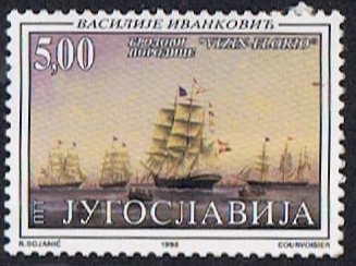 The stamp is designed after a painting made by Vasi Ivankovic and is titled “Sailing ships of Visin-Florio of Precanj 1873), the painting is now in the Kotor Maritime Museum.