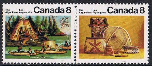 Algonkian is a family of related languages spoken over a wide area of Canada. When Europeans first arrived on the shores of this continent, Algonkian-speaking people occupied the whole Nova Scotia, New Brunswick and Prince Edward Island, most of Quebec, northern Ontario and parts of the Prairies. The Algonkian tribes populating these great eastern woodlands were the Ojibwa, Cree, Algonquin, Montagnais, Micmac and Malecite. The most important cultural item among the Algonkian Indians of the eastern woodlands is birchbark. It was used for the construction of canoes, wigwams and many types of containers. The Algonquins were a loosely organized tribe inhabiting the Ottawa Valley, both on the north side and on the south between the Ottawa and Lake Nipissing. Being hunters and collectors, they relied heavily on deer, berries, rabbits and fish. The territory of the Swampy or Woodland Cree extended from Lake Mistassini in Quebec to Lake Winnipeg and from the Ojibwa territory on the south to that of the Subarctic Indians on the north. Commonly considered a tribe, the Cree were in reality a series of bands, each fading into adjacent groups. The large area they inhabited had poor hunting resources and theirs was a marginal existence largely dependent on moose, deer, caribou and rabbits. The Ojibwa were the residents of the enormous wooded area west of the Ottawa Valley between the Cree on the north and the Iroquois of the Great Lakes region to the south. Each Ojibwa band tented to have its own dialect and way of life so that there were marked differences between the eastern and the western Ojibwa. As a whole, they were woodland hunters and fishermen who supplemented the results of their hunting skills with berries and wild rice. This necessitated seasonal migrations. In the winter they separated into small family groups and retired to a favourite hunting area. In the spring they collected maple sap and then gathered for the summer in larger villages where they planted corn. During the fall, the wild rice was gathered and white-fish were caught by those near Sault Ste. Marie. In the Maritime provinces were the Malecite and Micmac. They were primarily hunters and collectors of shellfish. Some corn was grown in southern New Brunswick. Northern Quebec was the domain of the Naskapi Indians. The south-west bands were called Montagnais by the French, and belong culturally and linguistically to the Algonkian group. Their population was small and their material culture, art and political structure extraordinarily simple because of the sparse resources of their environment. The anonymous painting "Micmac Indians" is reproduced courtesy of the National Gallery of Canada. The artifacts, photographed by Ray Webber, are from the collections of the National Museum of Man, the Royal Ontario Museum and Mrs. Alika Podolinsky-Webber. They are, from left to right; a Tête-de-Boule birchbark basket (the Tête-de-Boule are a division of the Ojibwa); an Ojibwa wooden papoose carrier; a pair of snowshoes for a Montagnais child; a Malecite birchbark basket; a Montagnais birchbark box; a Montagnais knife; and a Micmac birchbark basket decorated with porcupine quillwork. Typography and layout for the two stamps were the responsibility of Georges Beaupré.