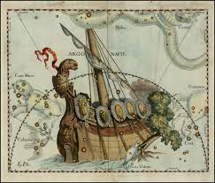 The original constellation was found low near the southern horizon of the Mediterranean sky. The ship became visible in springtime and sailed westward, skimming along the southern horizon (as depicted on the stamp). The ancient Greeks identified it with the ship sailed by Jason and the Argonauts in search of the Golden Fleece.
