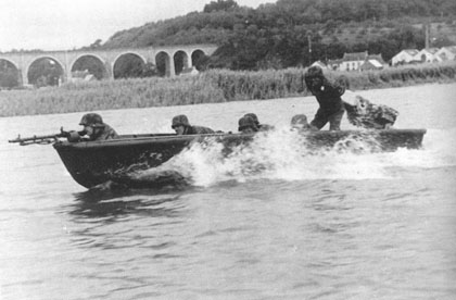 The Leichtes Sturmboot 39 was essentially a small, high-powered assault craft used for river and small waterway crossings and assaults. They were also employed on security and anti-partisan patrols along river ways in occupied territories. Leichtes Sturmboot were very fast, able to achieve about 30 mph with the use of an outboard motor extended from the rear of the craft. They were without much protection or firepower though, aside from the possibility of an attached MG at the bow of the vessel and the weapons of the men inside. Leichtes Sturmboot 39 were transported into battle by most German construction and assault engineer units and were used to spearhead river and small waterway assaults, usually in conjunction with an attempt to form a bridgehead for the construction of a bridge. The craft could carry 6 men or about a half-ton of weight.