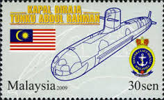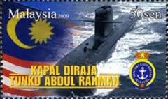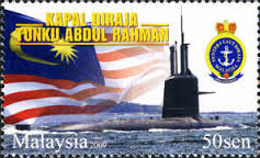 Malaysia issued a set of Three stamps to Commemorate the induction of the First Malaysian Submarine in Royal Malaysian Navy in Sep 2009. Kapal Diraja Tunku Abdul Rahman (KD TAR) is the first of the two Malaysian Scorpene Class Submarines. It also celebrates 75 Years of Malaysian Navy. Three stamps were issued on 03 Sep 2009. First stamp shows a graphic sketch of Submarine named after a reef Fish (Scorpene).