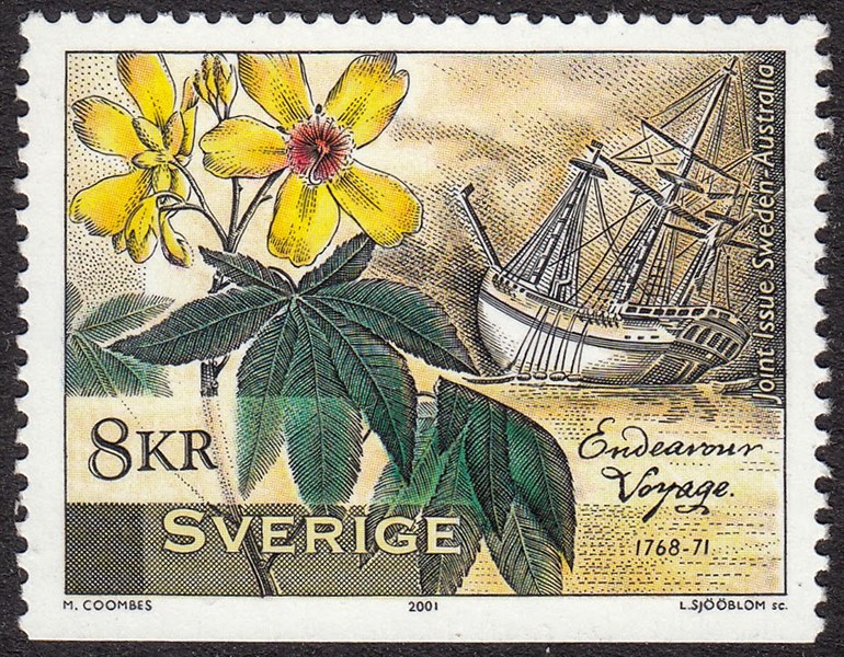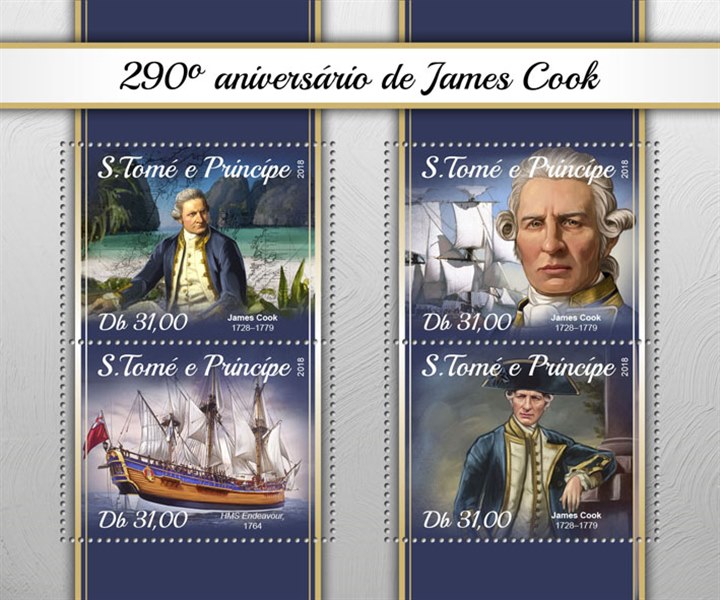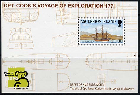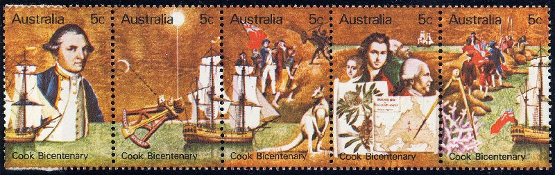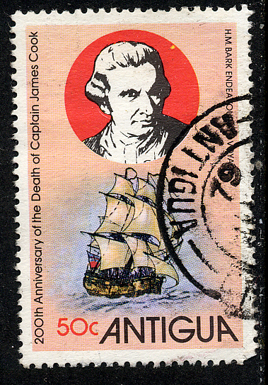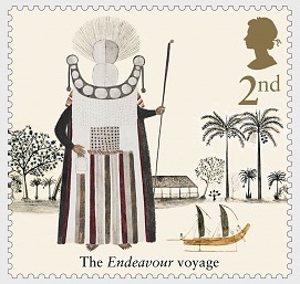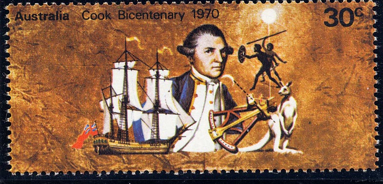The stamp shows us Captain Cook in Australia with in the background HMS ENDEAVOUR during the flag hoisting, when Cook claims the country for Great Britain.