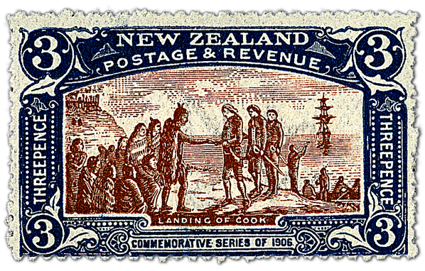 New Zealand 1906 3d sg372, Scott? by this stamp is given: The dual color three penny stamp depicts the landing of Captain Cook. on his first voyage to New Zealand; at Poverty Bay on the east coast of the North Island on the 7th of October 1769. This first meeting led to the deaths of six local Maori during skirmishes with the crew, due to a misinterpretation of the traditional Maori challenge. Cook was unable to gain many of the provisions he and his crew needed at the bay, and for this reason gave it its name.