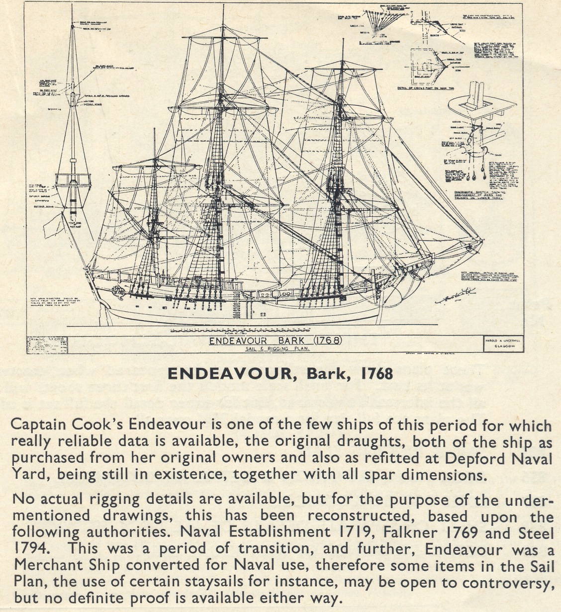 Commissioned May 1768 under Lieut. James cook (-1771; sailed on his first voyage 26.7.1768; returned 12.6.1771 and paid off Aug 1771. Refitted at Deptford (for £2,615.0.8)7-10.1771.