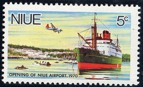 An issue from the Island of Niue, is for the opening of the airport, and the 5c. stamp shows the motorship Tofua, of the Union Steam Ship Company of New Zealand Ltd. The Tofua was built by Wm. Denny and Bros. at Dumbarton, in 1951, for the company's service between Auckland, Suva, Nukualofa, Vavau (Tonga), Niue Islands, Pago Pago, Apia, Suva and Auckland. Her gross tonnage is 5,299 tons, net 3,827 tons, and summer deadweight 3,827 tons. Dimensions: S90 ft. 8 in. x 55 ft. x 21 ft. 6% in. Machinery: twin-screw Sulzer oil engines, giving a service speed of 16'/2 knots. She has accommodation for 73 one-class passengers, is registered at Auckland, and is the second ship of the name, the first being built by Denny in 1908 and broken up in 1934.