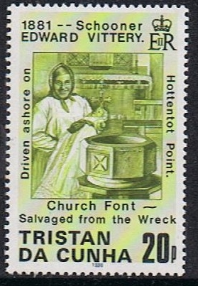 The stamp shows a lady with child near the stone font what was salvaged from the wreck of the British schooner EDWARD VITTERY.