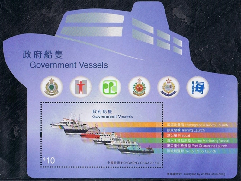 Hongkong Post introduces for the first time, a vessel-shaped stamp sheetlet to highlight the theme of this set of stamps. With a light blue backdrop, the stamp sheetlet features six government vessels assembled in a line and ready to perform their duties.
