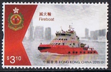 The $3.10 stamp shows the fireboat "Elite" of the Fire Services Department. Fireboat "Elite" is mainly responsible for marine firefighting, search and rescue operations and diving logistics support in the Hong Kong waters. It was engaged in fighting a No. 3 Alarm ship fire at Yau Ma Tei Anchorage in 2010, as well as searching and rescuing operation of the sinking incident of a river-trade sand barge at sea north of Tung Lung Chau and a bulk cargo vessel at sea west of Beaufort Island in 2010 and 2013 respectively.