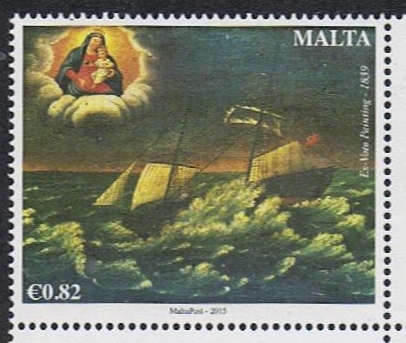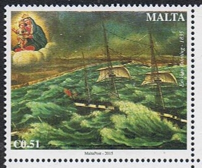 The painting portrayed on the € 0.82 stamp was part of a promise made by Giovanni Ellul when he was on the Barque MATUTINA on the 17th January 1839. During a great thunderstorm Ellul together with the other crew members found themselves blown sideways on the shallow banks at the mouth of the river Devripul. Those present aboard this ship prayed to the Blessed Virgin of Mellieand the following morning the pilot arrived and safely guided the ship into the river.