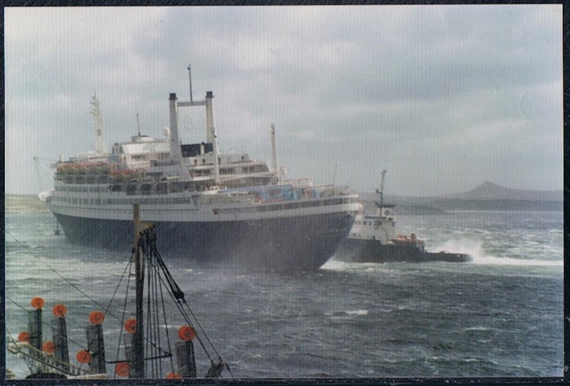 Sudden gale force winds and heaping seas prevented the tenders from returning all the tourist to the ROTTERDAM which finally sailed to find shelter in Berkeley Sound, after she has begun to drag her anchors. Those stranded on land took temporary refuge in the Town Hall and Cathedral until they were taken by a fleet of local vehicles to the canteen on FIPAS whilst attempts were made to find accommodation for the night.