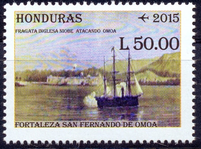 One of this stamps the 50.00 L shows us a vessel which is given by the Honduras post as the British warship HMS NIOBE attacking the town and fortress of Omea.