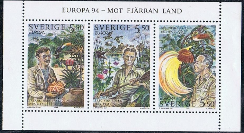 Sweden shows on his Europa stamps of 1994 three Swedish explorers, with in the background of the stamps the area which they explored.
