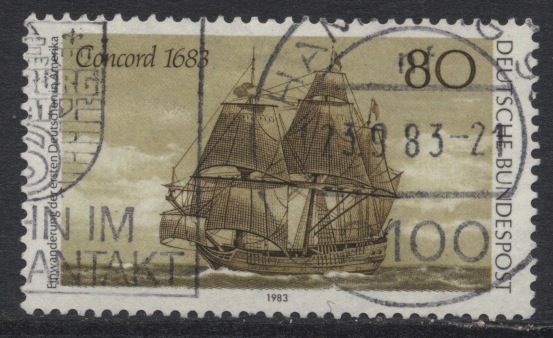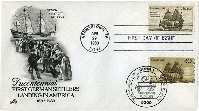 The stamps were jointly issued by USA (SG2028) and West Germany (SG2030) to commemorate German emigrants.