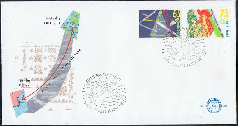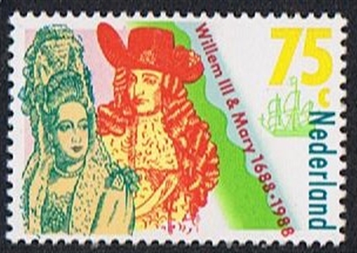 In 1988 the Netherlands issued a stamp which remembers the landing of the Dutch troops in the Torbay for the invasion of England in 1688, on the right of the stamp a small drawing most probably of a Dutch warship is shown, Prince Willem of the Netherlands with his wife Mary are also depict on the left of the stamp.