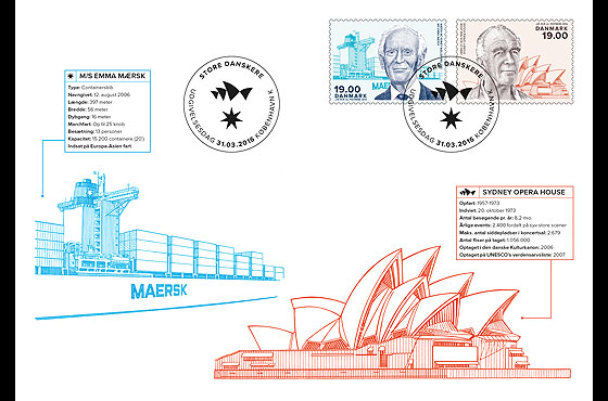 The graphic artist Torben Skov designed the first twelve stamps in the series. Now we are continuing the series with two stamps in a new design. One stamp depicts the architect Jørn Utzon (1918-2008), who put Denmark on the world map with his architecture, while the other stamp depicts the Danish shipping magnate Mærsk Mc-Kinney Møller (1913-2012), who inherited and continued to grow the Maersk Group, a shipping and energy conglomerate, with unfailing energy