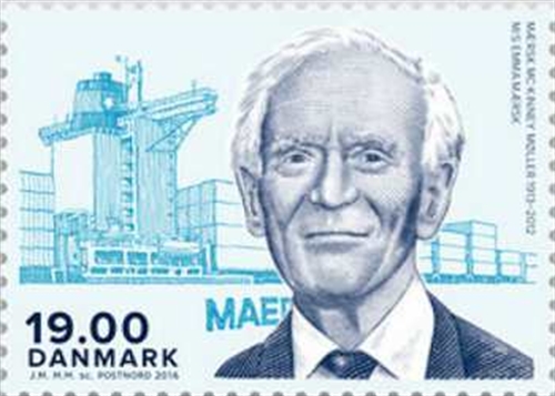 Denmark used in March 2016 two stamps in the series “Great Danes” one stamp shows us the Danish owner Maersk Mc-Kinney Moller with in the background the container ship EMMA MAERSK.