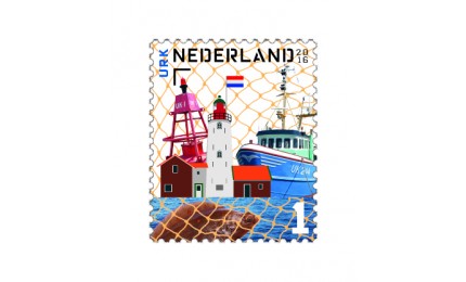 The “Beautiful Netherlands” 2016 stamp sheet devoted to the town of Urk is based on the layout and perforation which has been used for the “Beautiful Netherlands” series since 2005. The five identical stamps with a denomination of 1 for domestic destinations feature typical properties and buildings found in the town of Urk, including the UK1 buoy (pictured), the lighthouse (pictured) and the UK 244 prawn fishing boat (pictured), with the sea below. Pictured at the bottom is an image of a plaice: this image is spread across the stamp and the back of the sheet. The top and bottom parts of the stamp are linked together by a traditional fishing net in a contemporary bright colour. The background of the stamp sheet also contains pictures of some of Urk’s landmark sights, including a double bollard, fishing nets hung out to dry, the Urk village flag (showing a haddock in the centre), a mooring post, several homes designed in the typical Zuiderzee architectural style, the view over the harbour and a crane on the local shipyard. The strip of sea pictured on the stamps has been extended horizontally across the sheet like a tile panel. In the water at the bottom, we see both the plaice shown the bottom stamp and other fish species: from left to right, three mullets, a cod and a sole.