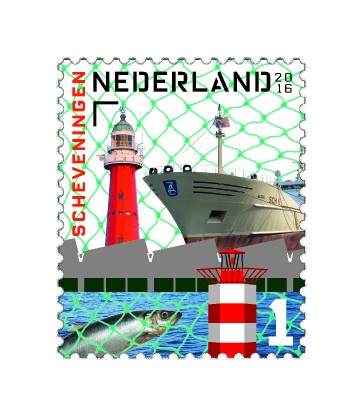 The Beautiful Netherlands 2016 stamp sheet: “Scheveningen” is based on the layout and perforation used for the Beautiful Netherlands series since 2005. The five identical stamps with a value denomination of 1 for mail within the Netherlands feature typical properties and buildings found in the town of Scheveningen, including the fish auction building with its striking silhouette (pictured), the lighthouse (pictured) and the trawler SCH 6 ALIDA with the sea below, showing a beacon which in reality is on one of the jetties. Pictured at the bottom is an image of a herring. The image is spread across the stamp and the back of the sheet. The top and bottom parts of the stamp are linked together by a traditional fishing net in a contemporary bright colour. The background of the stamp sheet contains images of various Scheveningen landmarks, including a seagull perched on a scaffold pole, a 1930s home at the centre of the harbour area, the barrel monument, Panorama Mesdag overlooking the town of Scheveningen, Paviljoen Von Wied in the dunes, the obelisk for the later King William I’s arrival in 1813, the Scheveningen Pier and Gerard Bakker’s fisherman’s wife statue. The strip of sea pictured on the stamps has been extended horizontally across the sheet like a tile panel. In the water at the bottom, we see both the herring shown on the bottom stamp and other fish species: from left to right, two mackerels, three herrings, a brown crab and a plaice. The font used is Oxide by FontFont, designed by Christian Schwartz (2010).