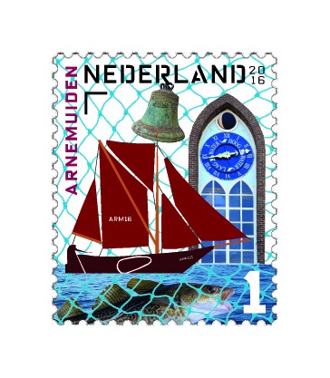 Arnemuiden The five identical stamps with a value denomination of 1 for mail within the Netherlands feature typical objects and buildings found in the town of Arnemuiden: the Hoogaars ARM 16 (pictured), a church bell (pictured) and the Dutch Reformed Church’s astronomical clock (pictured), with the sea below. Pictured at the bottom is an image of a cod. The image is spread across the stamp and the back of the sheet. The top and bottom parts of the stamp are linked together by a traditional fishing net in a contemporary bright colour. The background of the stamp sheet contains images of various Arnemuiden landmarks, including an anchor, a stone lion with a shield featuring Arnemuiden’s coat of arms, the front wall of the station, a historic flag of the city, the Kotter ARM 44 NEELTJE JANNETJE, a light buoy, the historic shipyard with its surrounding houses, the statue of the female fish pedlar, the Nooitgedacht windmill and a typical Arnemuiden prawn basket. The strip of sea pictured on the stamps has been extended horizontally across the sheet like a tile panel. In the body of water shown at the bottom, we see the cod in the bottom stamp as well as other species of fish. Pictured from left to right: a mussel, a herring and a North Sea prawn. The font used is Oxide by FontFont, designed by Christian Schwartz (2010).