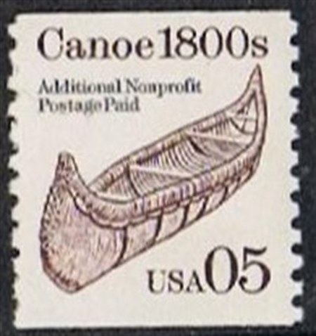 The canoe depict on this USA stamp is a birch bark canoe used by the Chippewa Indians in Minnesota in the 1800s.