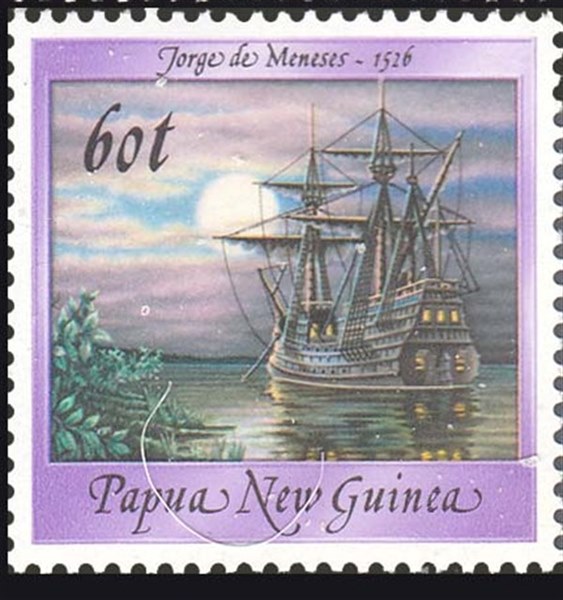 The two stamps shows us a Portuguese galleon in which Jorge de Menezes arrived in Papua New Guinea, not a name for the ship is given, and I believe there is not a painting or drawing which shows the ship or Jorge de Menezes. Most probably a ship of that time frame is shown.