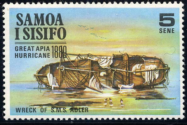 S.M.S. Adler, a gun vessel, was launched in 1883, and cost £44,047. She had a displacement of 884 tons, was 177 ft. 2 ins, in length with a 32 ft. 10 in. beam, her draft being 11 ft. 6 in. With a composite built hull and a single screw, her armament consisted of two 15 cm. 31/2-ton breech-loading rifled guns and two 12 cm. 27 cwt. similar type guns. Engines of 724 i.h.p. gave her a speed of 11 knots. The 5 sene stamp shows her lying on the reef after the typhoon.