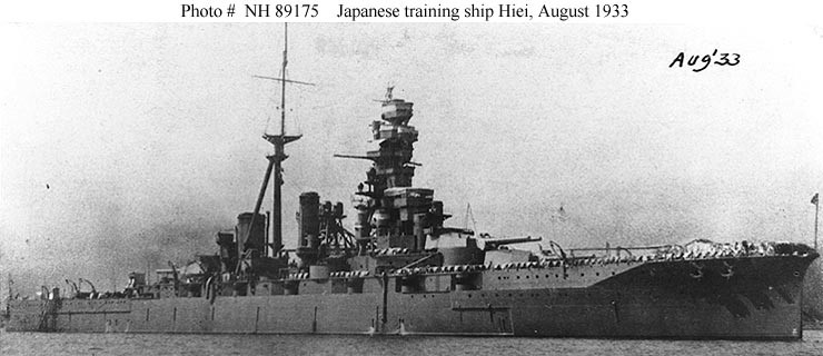 HIEL. Battle Cruiser. Japanese Navy. Built in 1914 by Kawasaki, Kobe. Keel laid 4th November 1911. Launched on 21st November 1912. Completed 4th August 1'914. 29300tn. L704'. B92'. Dr20'9". Powered by Parsons turbines. 13800hp. 4 screws. 18kn. Armed with Eight 14". Sixteen 6". Eight 5" AA guns. Four 21" TT. Complement 980. Demilitarised under the London Treaty and employed as a sea going Training Ship. The Emperor of Manchukuo visited Tokyo in her 1935. She was rearmed during WW2. On 14 November 1942 she was hit off Savo Is. in the Solomons by the US Navy and Air Force and scuttled as she could no longer steer, being the result of damage from gunfire. She sustained 85 hits including some 16" shells, 3 torpedo hits and bombs - Japan 1935. 6s. SG276-8. (LB4/80. 11/77)