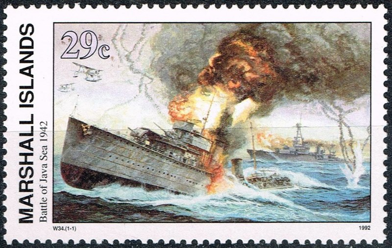 I have been looking a little deeper in this issues of the Marshall Islands, “Battle of the Java Sea”, I found that the ship in the foreground is given as Karel Doorman’s flagship DE RUYTER but she is a complete different ship as depict on the stamp.