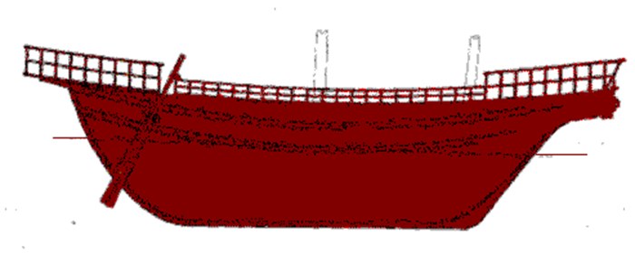 The picture shows a reconstruction of what this ship must have looked like. The lines show the probably water level. From a wreck of an Etruscan ship found off the island of Giglio, we have a reasonable idea of their construction. There is evidence to show that planks were butted together (not overlapped) and bound in place using thick ropes, which were passed through 2 centimetre (1") diameter holes in the planks. The gaps were probably then sealed using pitch.