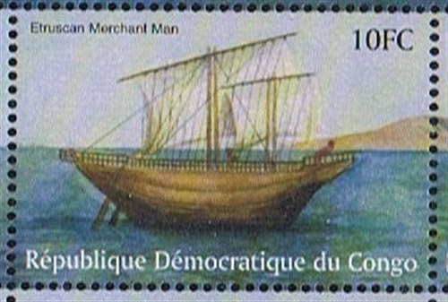 We have a rough idea what Etruscan merchant ships must have looked like from a wall painting in The Tomb of The Ship in Tarquinia. This shows a two masted sailing ship, perhaps some 20 metres long. The perspective has been over-exaggerated by the artist, since the ship was painted on dry land, presumable looking up at it from below.