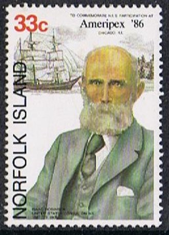 The stamp issued by Norfolk Island depict Isaac Robinson (1825-1912) the only consul of the US on Norfolk Island with in the background most probably a US whaler, who made calls at the island many times in the 19th century. I don’t have any details on the vessel depict, the whalers from the US were mostly about three years away from their homeport and for fresh provision and water were making regulars calls on the islands in the Pacific.