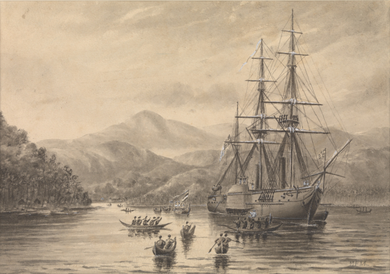 Under the command of Capt. John Moresby, H.M.S. Basilisk, visited a number of places in New Guinea in 1873 and 1874. During this time, Moresby charted much of the South-East and North-East coasts. On February 21, 1873, passing through what he named Basilisk Passage, he entered the finest harbour on the coast. He put on the map the names Port Moresby and Fairfax Harbour, in honour of his father, Admiral Sir Fairfax Moresby. In an account of his enterprise published in London in 1876, Moresby declared: "It is not on record that any ship before the Basilisk had ever passed from South to North New Guinea, without first going some 240 miles to the eastward, to avoid the great Louisiade Reefs, which stretch that distance East. "She has found a safe ship channel through these reefs and opened a highway for commerce. The Basilisk has placed on the chart more than 140 islands and islets, of which 25 are inhabited, and has added many excellent harbours and safe anchorages to our knowledge." H.M.S. Basilisk was a wooden paddle sloop, unarmed, of 1,031 tons (b.m.), 185 ft. long, beam 34 ft. She was built at Woolwich Dockyard in 1848; broken up at Chatham in 1882.