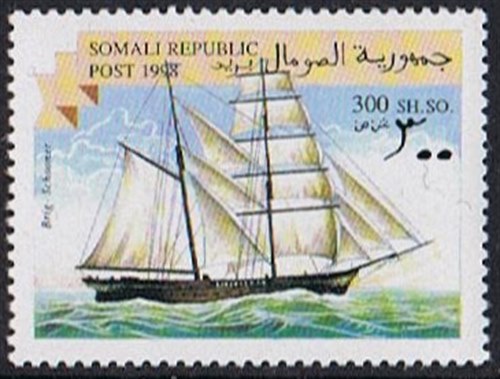 The stamp inscription gives “brig-schooner” but she is rigged as a hermaphrodite brig, a term used in the late 18th centuries for a vessel that carried as many as 5 square sails on the foremast and a fore-and-aft mainsail with a gaff topsail. Numerous staysails between the masts and jibs to a long bowsprit. The type is now usually called a brigantine.
