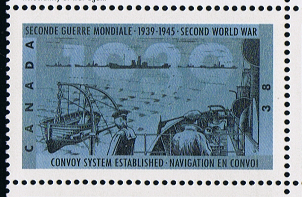 The Canadian stamp shows us a warship in the foreground with a convoy of merchant ships during World War II.