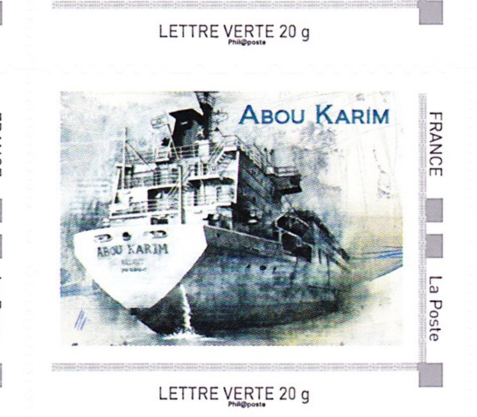 The stamp shows us that the ABOU KARIM is depict, a few ships of that company carry that name, with a number added. The stamp shows us a ship with the ships name ABOU KARIM but without a number, also the vessel has bridge wings, the only vessel under that name which has sailed by that company which carried the name ABOU KARIM and has bridge wings is the 1976 built BERNARD SCHULTE.