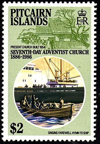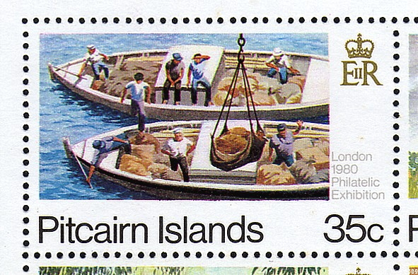 Pitcairn Island 1964 ½d and 2d sg 36 and 38 scott 38 and 39. 1969 8c sg100, scott103. 1972 4c and 20c sg124/25, scott127/28. 1974 35c sg154. Scott?. 1977 2c sg175 and 5c sg176, scott?. 1984 50c/$2 sgMS 263, scott?. 1986 $2 sg295, scott280. 2000 20c sg?, scott511b. 2008 50c/$3.50 sg?, scott? (The cargo vessel on the $1.50 stamp in the background is I believe one of the Associated Container Transportation (Blue Star) ships of the ACT class.)