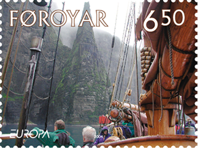 The motif on the DKK 6.50 stamp is a view of the west side of Hestur with a deep gorge and a towering cliff. Close to this area it is possible to sail by dinghy into a grotto where the acoustics are so unique that concerts have been held there.