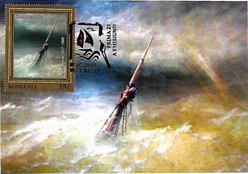 Romania issued four stamps in 2017 depicting marine landscapes in paintings, only the 15l depict a part of a mast of a shipwrecked vessel, on which some people cling. Could not find anything on the wreck, so most probably it is an artist imagination of a shipwreck. The painting is in the National Art Museum in Bucharest, Romania.