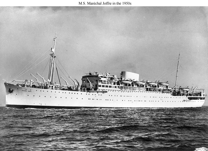 She served as troopship for the French Army till March 1950, and after refurbishing at La Ciotat between March 1950 till September 1951, used first as a liner on the Indian Ocean, when the CHAMPOLLION was wrecked used in the Mediterranean line from 1953, then used in the Indian Ocean and Far East line; 03 February 1957 she got engine trouble and had to be towed to Dakar. Her last days she was used in the North Africa services and carried many troops from France to the trouble spots in North Africa.
